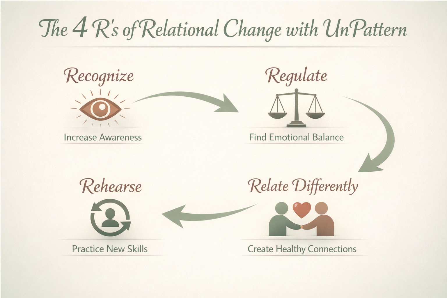 UnPattern is a psychology‑informed framework designed to interrupt relational patterns in real time—not just explain them after the fact. Instead of changing who you are, we focus on how you respond when you’re emotionally activated so you can choose differently in the moments that matter.