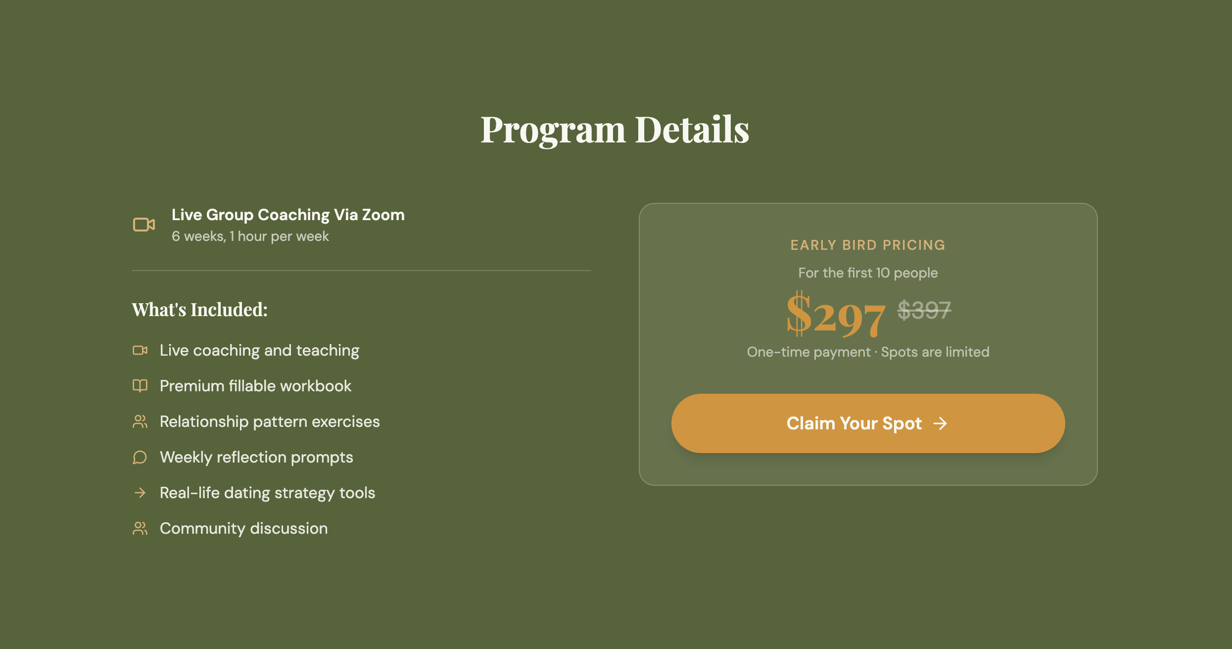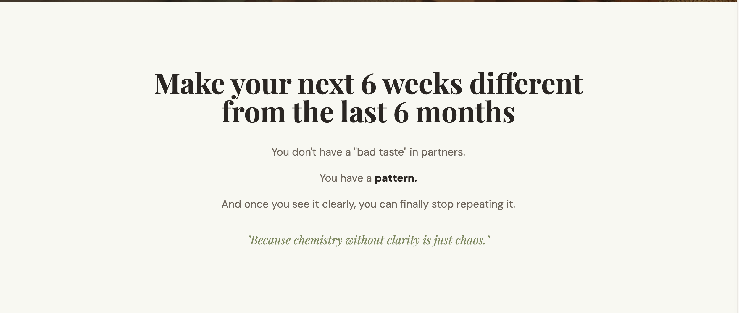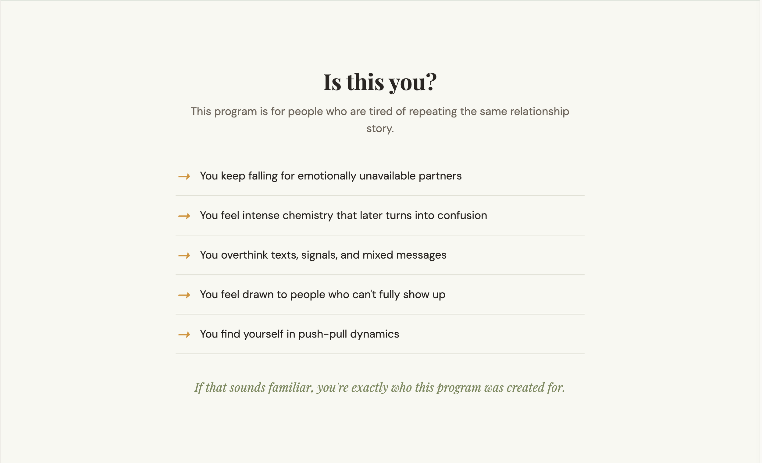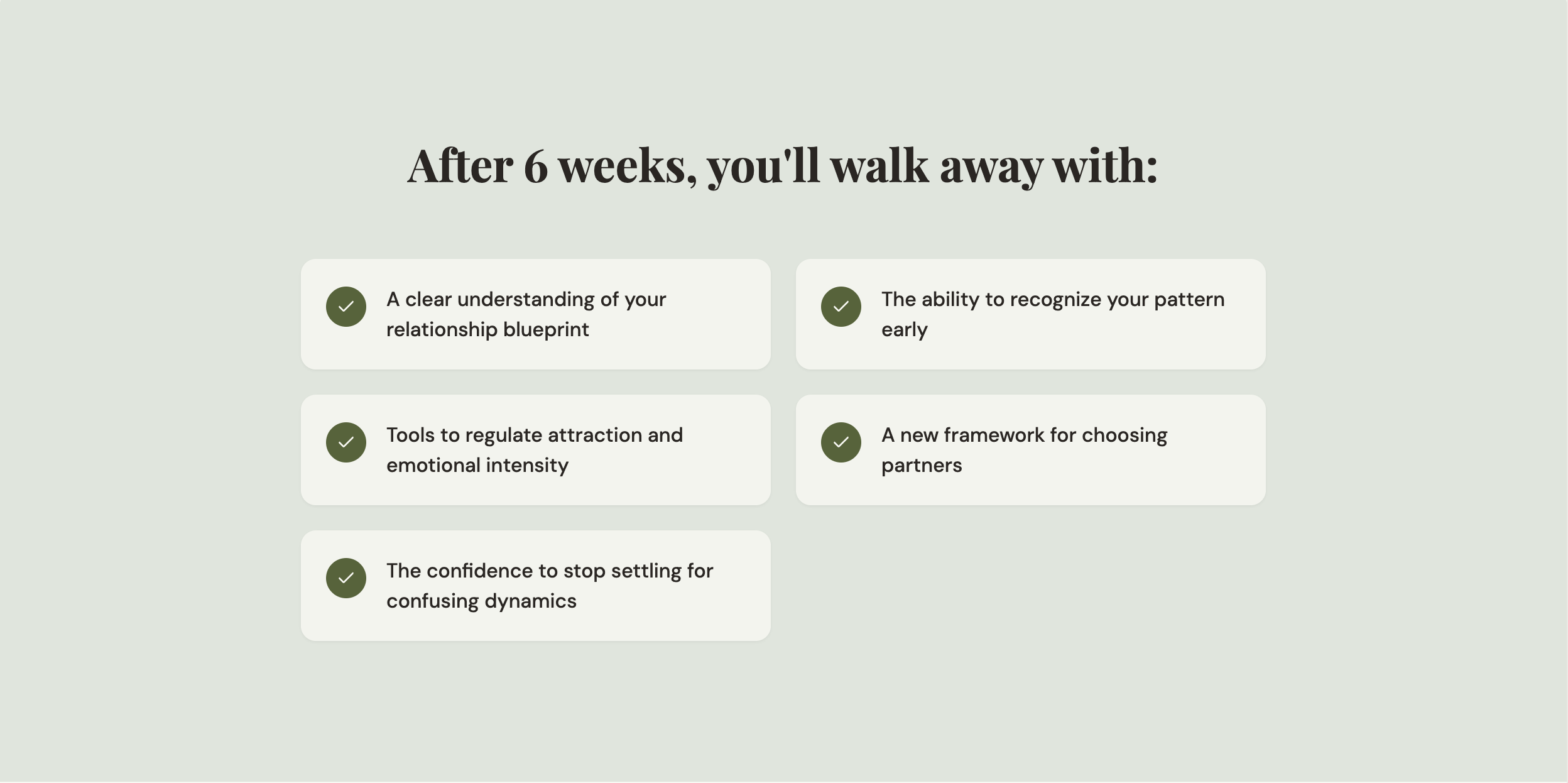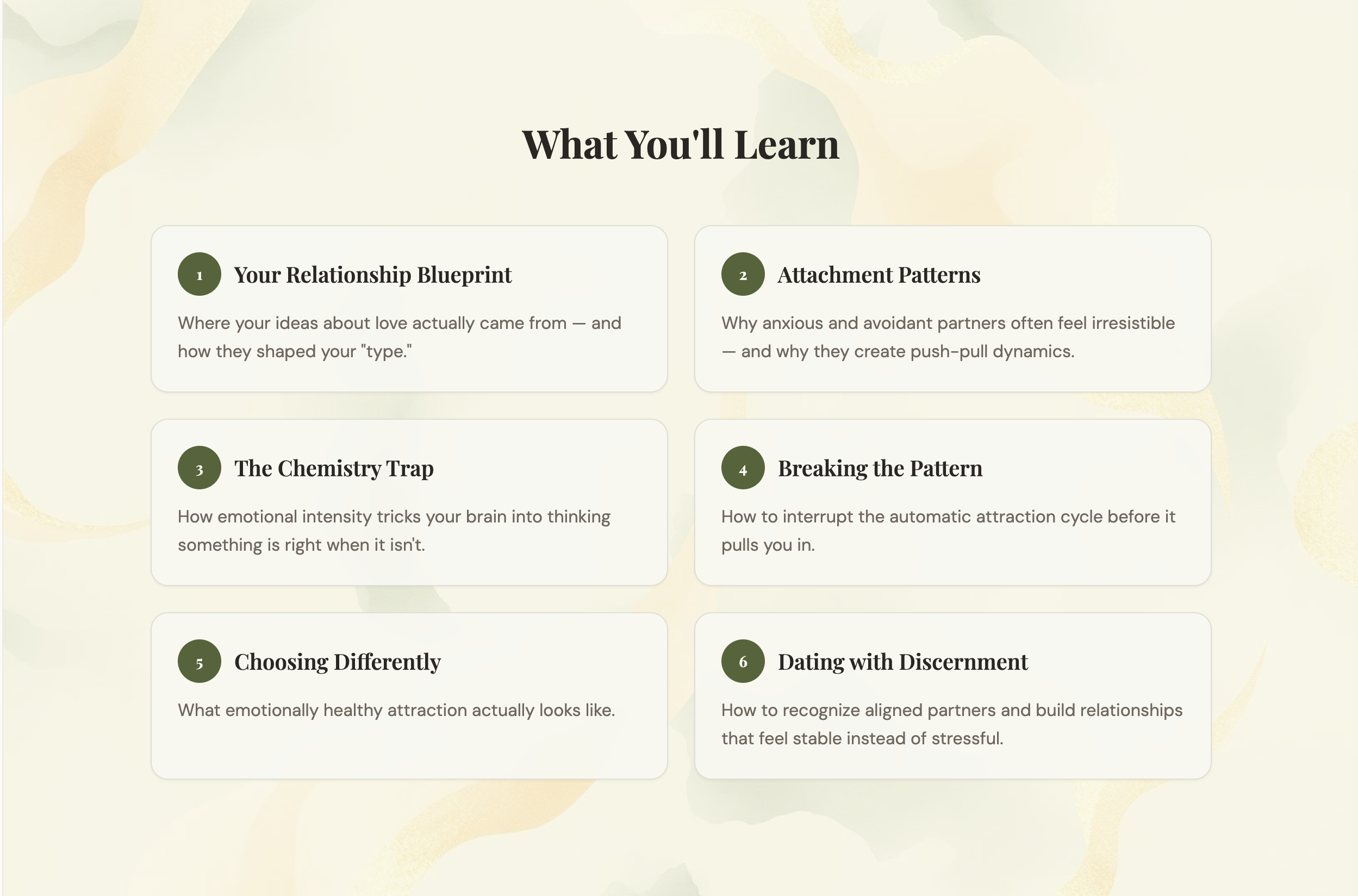In this program, we’ll break down the psychology behind your relationship patterns and teach you how to choose differently. Not through dating rules or surface-level advice. But through real psychological insight and practical tools.